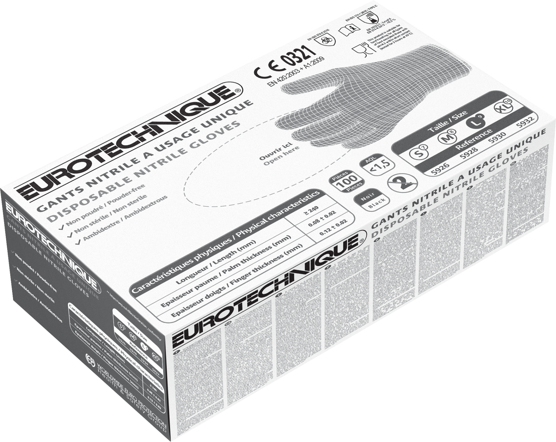 fekete színű, púdermentes, egyszer használatos nitril kesztyűk * vegyszerálló, rugalmas, mindkét kézen használható * mikroorganizmusok elleni védelem és folyadékok behatolásával szembeni védelem * AQL: 1,5