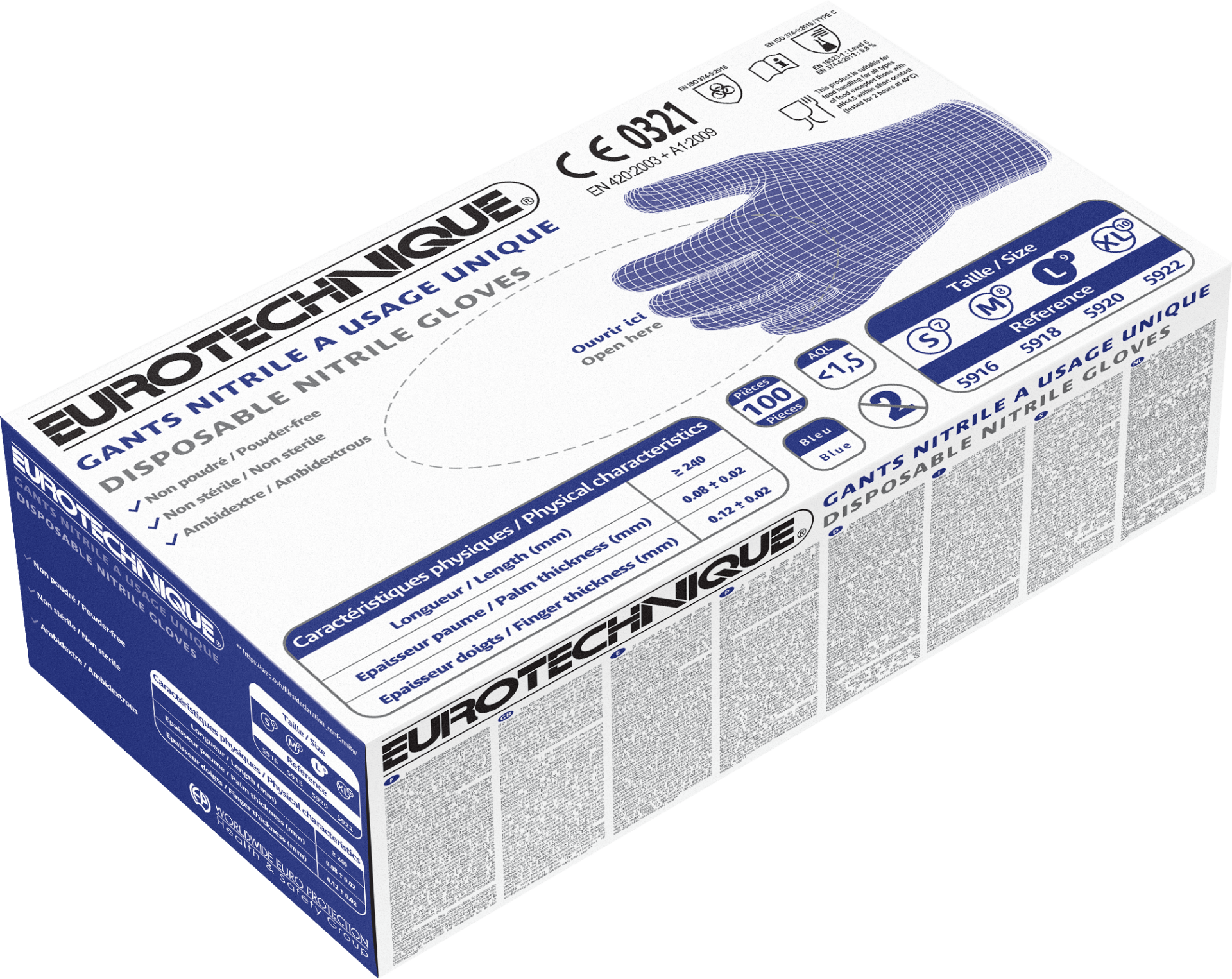 100 darab kék nitril, púder mentes, nem steril, 0,10mm vastag szegélyezett madzsettájú vizsgáló kesztyű AQL: 1,5