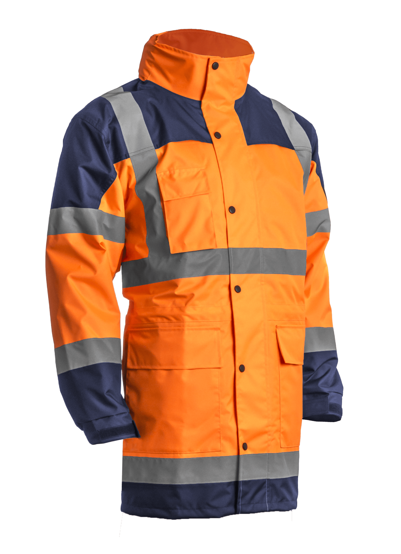 180 g/m2 vastag poliuretánnal mártott 100% Oxford 300D poliészter alapanyag, 100% poliészter hálós bélés * 5 cm széles fényvisszaverő csík: 2 a test körül, 2 a karokon és 2 a vállakon át * az alapanyag vízállósága: 3000 mm, hegesztett varrások, a gallérban rejtett vihar kapucni * álló gallér végéig futó, patentos fedett cipzár