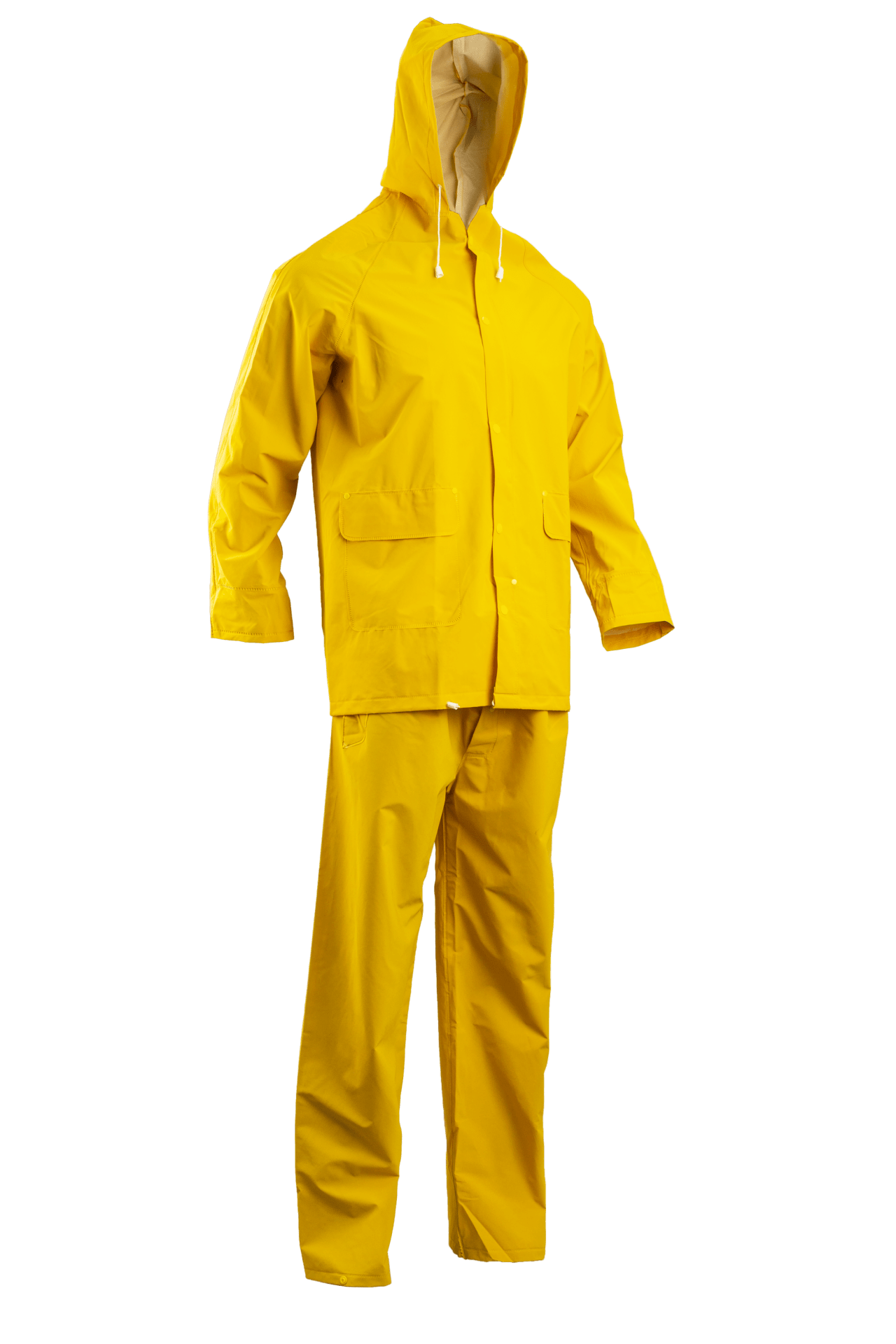 poliészter/pamut alapra kétszer mártott PVC * 0,32 mm vastag, varrott és hegesztett, vízálló * cipzáras és patentos záródás * KABÁT: 85 cm hosszú, fedett cipzár, húzózsinóros kapucni, szellőzőnyílás a háton, 2 fedett oldalzseb, állítható aljrész * NADRÁG: gumírozott derék, patenttal szűkíthető lábszár, sliccelt zsebnyílás, patenttal záródó slicc